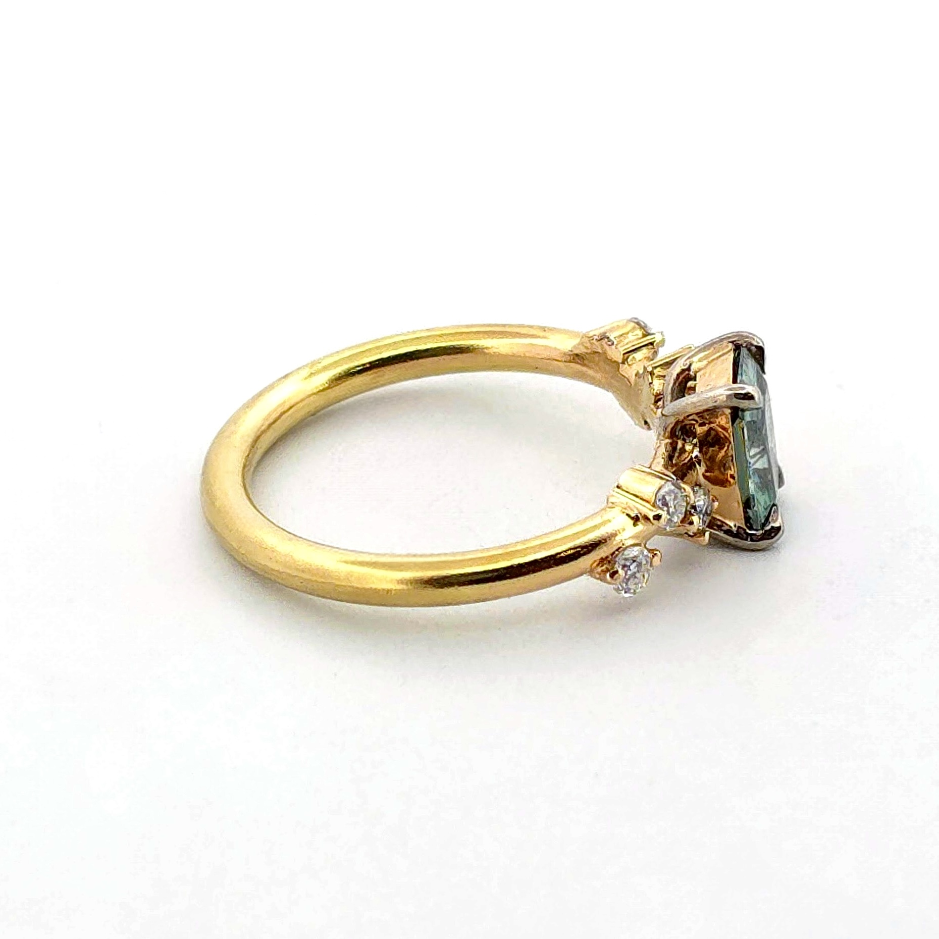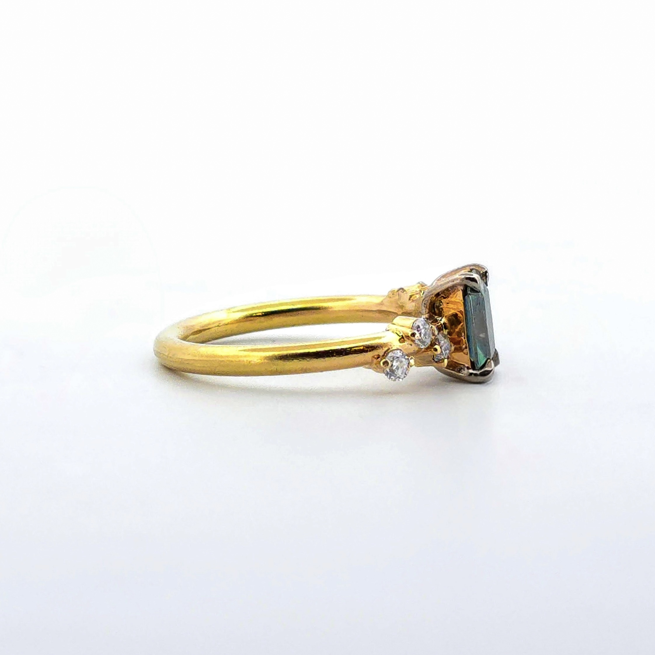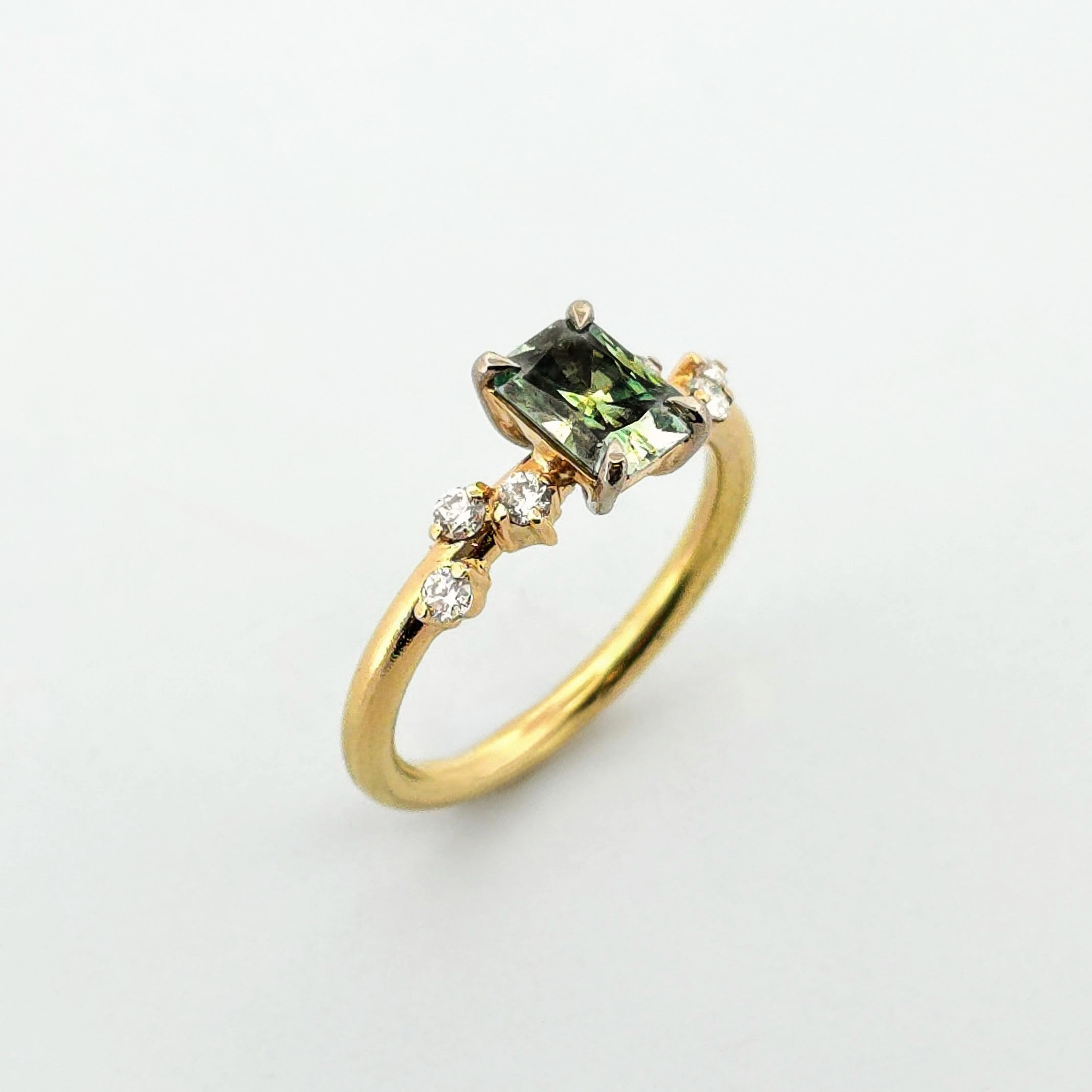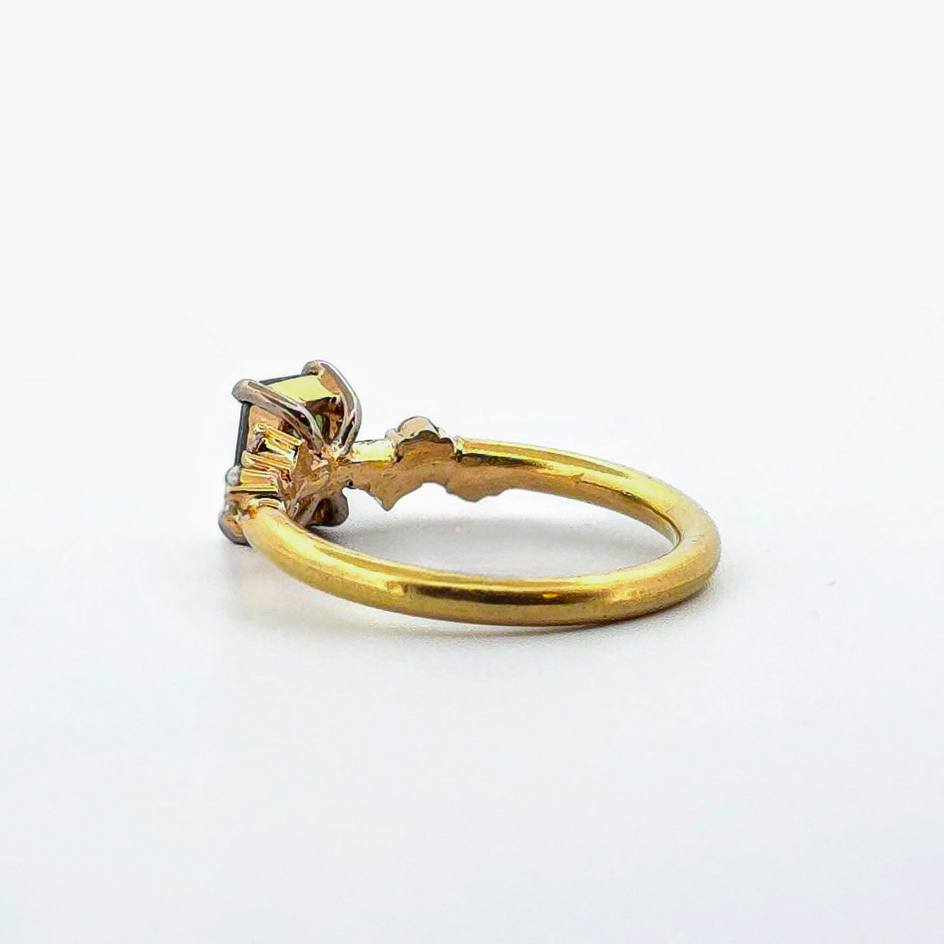 Denna ring är ett hantverksmässigt mästerverk av Erik Oxelgren. Genom att kombinera det varма, klassiska 18K rödguldet med den moderna Radiant-slipningen har han skapat en ring med en otrolig visuell tyngd. Radiant-slipningen är känd för att maximera stenens ”eld”, vilket gör att den gröna huvudstenen praktiskt taget glöder mot guldet.
